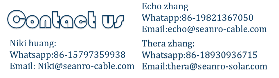 Shanghai SeanRo Wire and Cable., Ltd. Concentrates on the research, development and innovation of wire cables. It has owned many patents in the new robot field. Meanwhile, it produces different types of cables which are applicable for the special occasion. The company can meet various requirements of customers by customization. It can also provide the short delivery time, suitable model selection, specialized installation guidance and other overall after-sales services.Main products and business:Cable: Solar cable, drag chain cable, CE cable, control cable and ROV cable.Cable accessories: solar cable connectors, SPD, MCB, PV fuse and holder, scrimping tool and so on. Q1. How can I place order?
